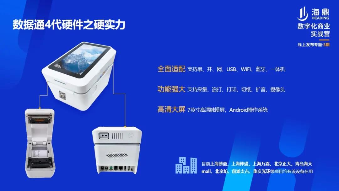 目前,海鼎科技數(shù)據(jù)通4.0產(chǎn)品已經(jīng)在博薈廣場(chǎng)、北京正大廣場(chǎng)、海天mall、前灘太古里、重慶光環(huán)購(gòu)物公園等國(guó)內(nèi)知名商業(yè)體中投入使用。