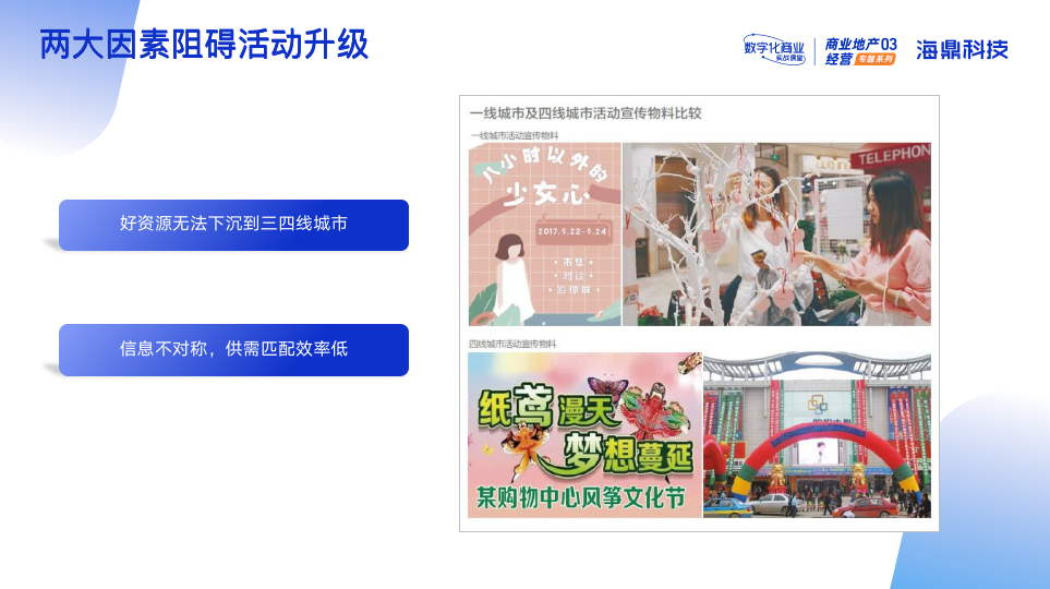 多項數(shù)據(jù)顯示,同一個活動在不同的商場,所呈現(xiàn)的效果具有明顯差異。在這些數(shù)據(jù)中也發(fā)現(xiàn)了兩大因素在阻礙活動的升級。首先,好的資源無法下沉到三四線城市,即新型活動資源和活動創(chuàng)意的下沉邊界卡在二線城市上。而且,商場活動供應商的資源透明度低,三四線城市的小型開發(fā)商合同結(jié)款方面操作不規(guī)范,外來供應商很難以與其建立互信關(guān)系,導致活動資源下沉動力不足。