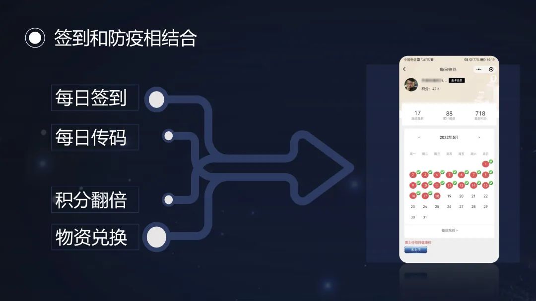 首先,紅星大衛(wèi)茂在會員系統(tǒng)中做了相應的防疫小改動,新增每日上傳健康碼的功能,連續(xù)上傳積分能產生連擊效果,積分可以兌換防疫基礎物資,這項改動也得到了當地有關部門的認可和支持,在地方項目上被評為防疫先進集體。