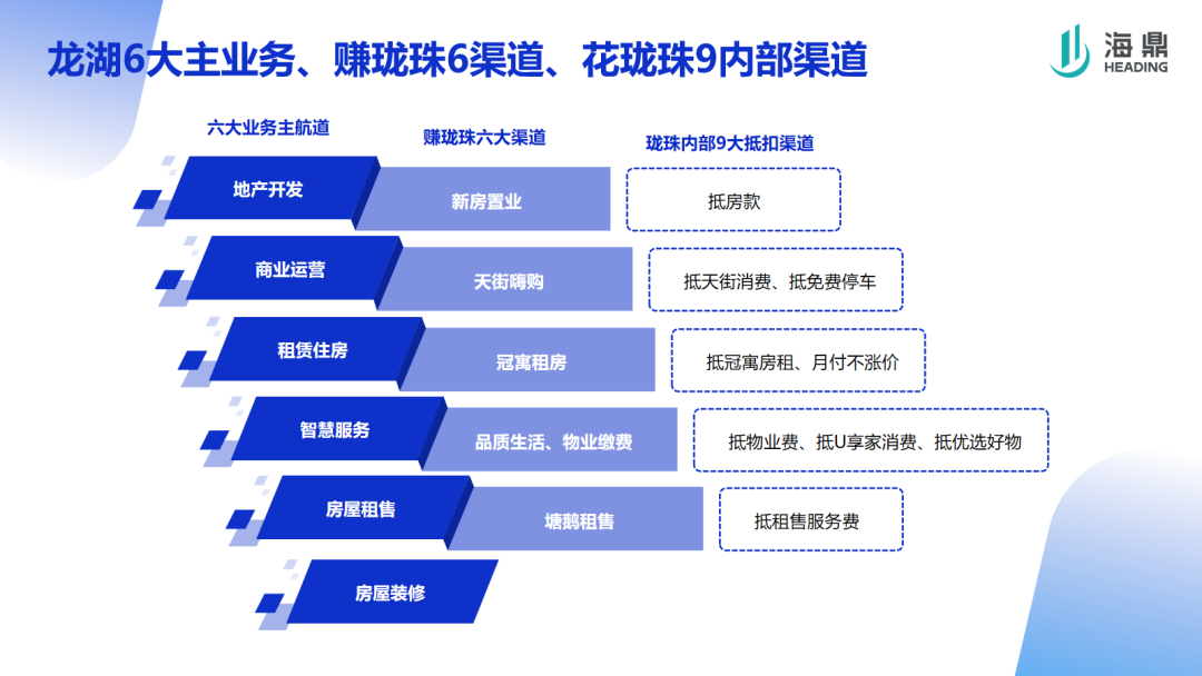 消費者賺取瓏珠,主要是可以通過六種途徑,比如在天街系列項目消費,在龍湖的線上渠道網(wǎng)購或是進行不動產(chǎn)類業(yè)態(tài)進行購買或租賃等等。那么同樣的,消費者在賺取瓏珠后,就可以使用這些龍珠去抵商場消費、抵房款、抵房租、抵物業(yè)費等等,其所謂的瓏珠內(nèi)部抵扣的9大渠道,都是龍湖6大主業(yè)務(wù)的關(guān)聯(lián)渠道。